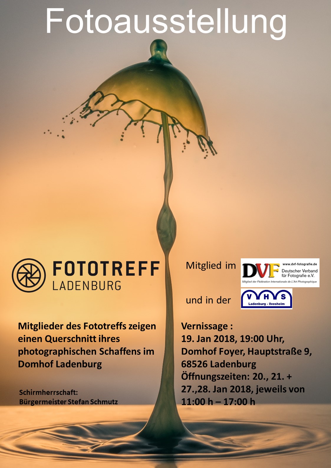 Ausstellung im Domhof Ladenburg 2018 Bernhard Martus: Ahorn Bernhard Martus: Birnbaum Bernhard Martus: Kirschbaum Bernhard Martus: Nussbaum Einladungskarte hinten Einladungskarte vorne Gerhard Pflästerer: Der Schrei Gerhard Pflästerer: Kormoranporträt Hans Assmus: Henrichshütte I Hans Assmus: Henrichshütte II Hans Assmus: Henrichshütte III Hans Assmus: Henrichshütte IV Hans Müller: Drei Mädchen und ein Knabe Hans Müller: Fernmeldeturm in Mannheim Hans Müller: Rastplatz an der Ostsee Hans Müller: Wellenreiter Helga Arnold: Auf den Kopf gestellt Helga Arnold: Herbstpfütze Helga Arnold: Seifenblase Helga Arnold: lichtdurchflutet Helmut Raab: Die Vereinigung Helmut Raab: Ferne Planeten Helmut Raab: Flüchtendes Licht Helmut Raab: Grüner Fluss Helmut Raab: Lichtinstallation Helmut Raab: Magisches Tourbillon Helmut Raab: Tomatenschönheit Michael Kunze: Kurzzeitfotografie (01) Michael Kunze: Kurzzeitfotografie (02) Plakat zur Ausstellung